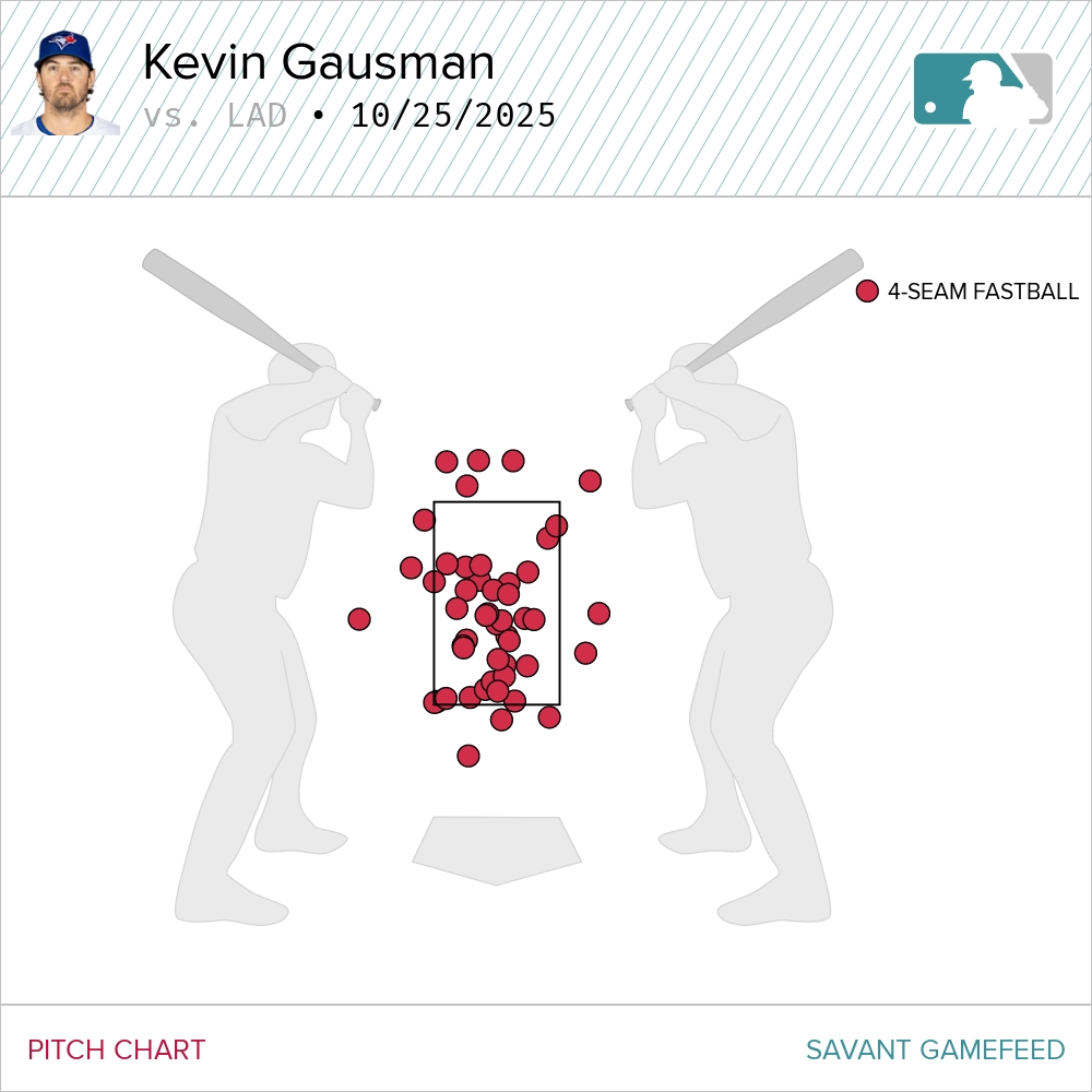 After the Dodgers neutralized Trey Yesavage’s unicorn splitter in Game 1, they didn’t have an answer for Gausman’s, which induced eight whiffs on 13 swings (62 per cent) and was responsible for five of his six punchouts. And he used it just 35 per cent of the time, the lowest usage of his five post-season starts by half a percentage point.