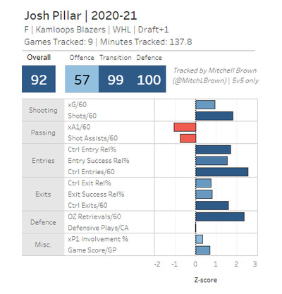 This is an area where Pillar’s defense helps drive offensive impacts. He can read plays and pick off or deflect passes, and create turnovers. This is why he’s been used a lot on the PK by Kamloops and Saskatoon. It’s also why he gets good ratings and reviews for his transitions — creating turnovers in his own end helps exit the zone and counter attack quickly with control.