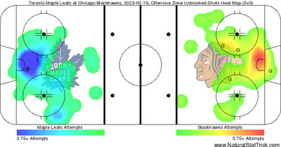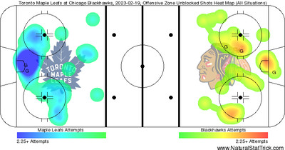 At the time of the last goal, you can see that the Leafs opening it up to try to score had the expected effect of Chicago getting some better quality looks. You can’t defend a lead when you don’t have one.