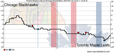 As you can see, Chicago came out very hard, and the Leafs did not respond until into the second period. But does that mean they’re “playing down” and getting totally outplayed? Well, you decide: