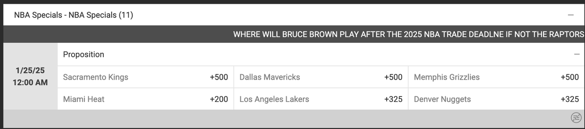 Some Bruce Brown trade odds courtesy of @BodogCA. They have the Miami Heat as the most likely landing spot. I assume that would be as part of a bigger three-team Jimmy Bulter deal pic.x.com/YY5riINf0K – 10:04 AM