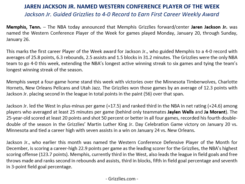 This marks the first career Player of the Week award for Jackson Jr., who guided @memgrizz to a 4-0 record. pic.x.com/xqj0Z4523n – 3:31 PM