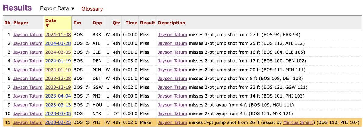 Tatum had missed 11 straight game-tying or go-ahead shots in the final 5 sec. of the 4Q/OT before Saturday’s winner over Toronto (SAT’s 4Q miss not listed). Last make was that great back court play for the GW 3 @ PHI in ’23. pic.x.com/faTy9kqYnW – 3:12 AM