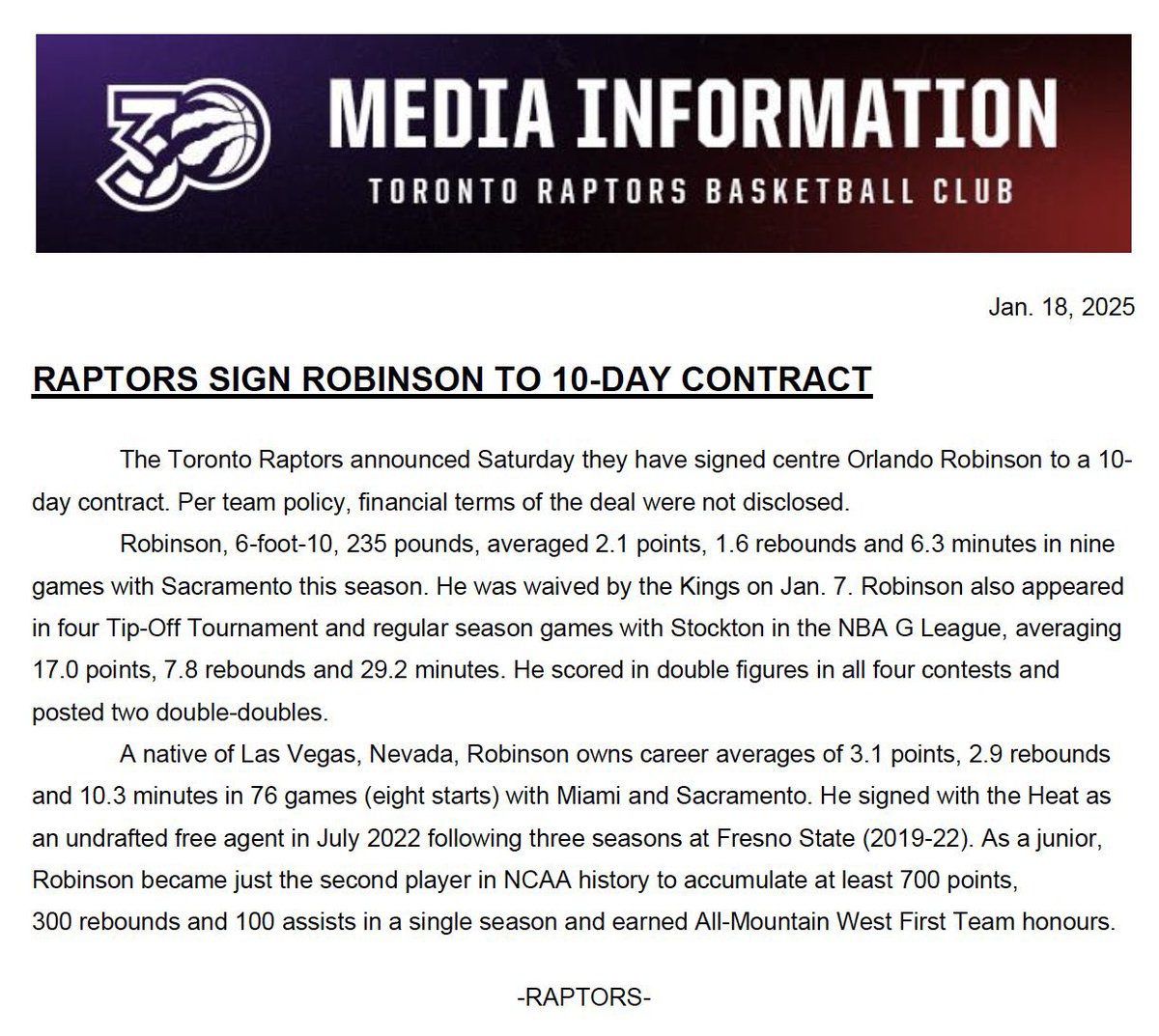 Blake Murphy: The Raptors have signed Orlando Robinson to a 10-day contract. Omoruyi’s 10-day expired yesterday. A chance to take a look at Robinson, with Raps and/or 905, ahead of post-deadline decisions on use of that roster spot. -via Bluesky / January 18, 2025