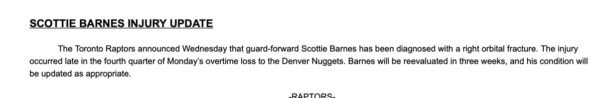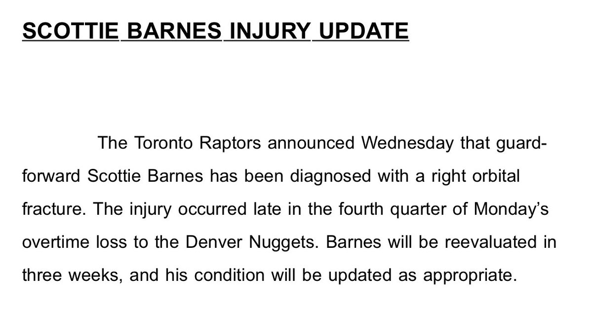 Breaking: Scottie Barnes has been diagnosed with a right orbital fracture. Barnes will be reevaluated in three weeks, and his condition will be updated as appropriate, the team announced. pic.x.com/86GS0dsjSK – 1:35 PM